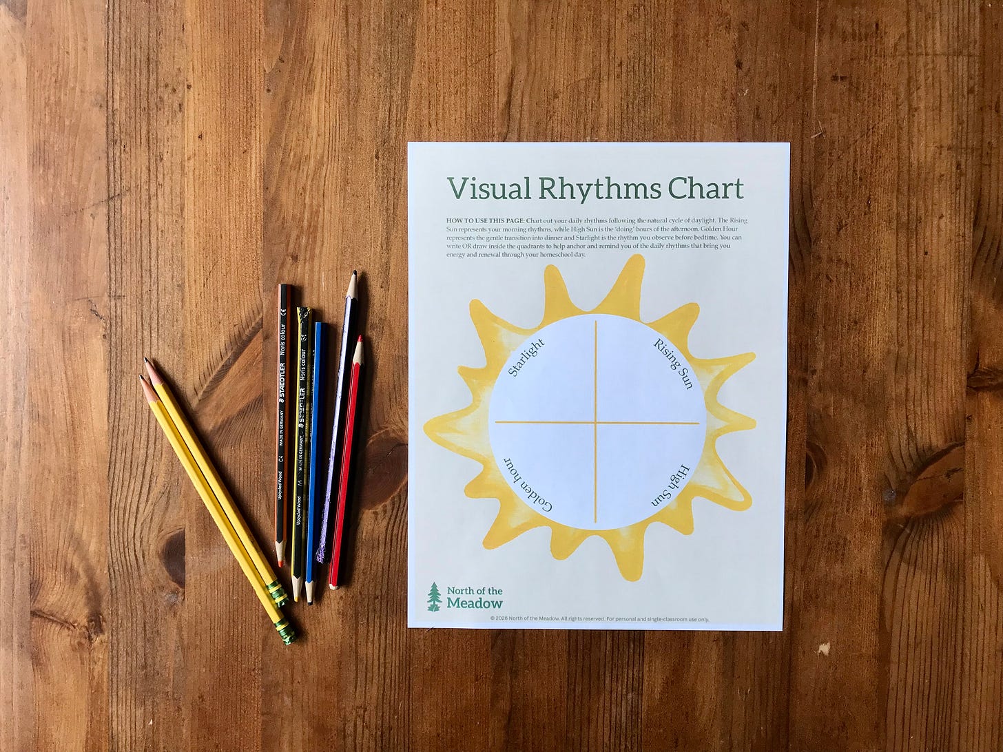 We also use a Visual Family Sun Rhythms Chart—a simple, beautiful printable that helps the kids see the day as a circle rather than a linear list. It’s a tactile way for them to see their day and understand where they are in the world.